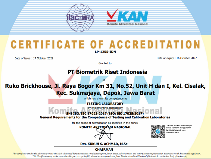Berdasarkan surat pemberitahuan hasil rapat KAN tertanggal 25/05/2022 Nomor: 645/3.a.1/LAB/05/2022, Perihal: Keputusan Akreditasi, bahwa KAN telah memutuskan untuk memberikan reakreditasi kepada PT Biometrik Riset Indonesia sebagai Laboratorium Penguji (LP-1255-IDN) sesuai ruang lingkup akreditasi yang diajukan. Masa akreditasi ISO/IEC 17025:2017 oleh KAN berlaku selama 5 (lima) tahun dari tanggal 17 Oktober 2022 – 16 Oktober 2027.